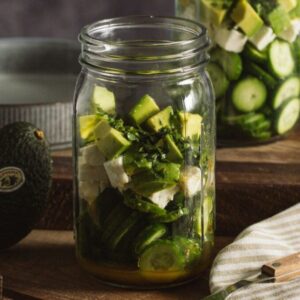 - In a bowl or jar, layer the cucumber, avocado, and cheese
